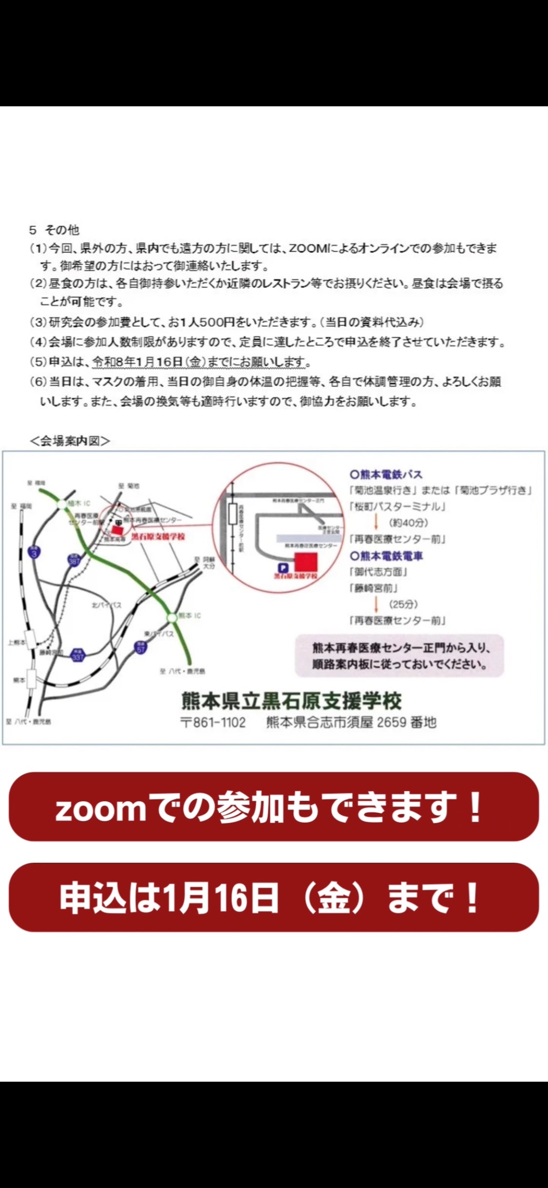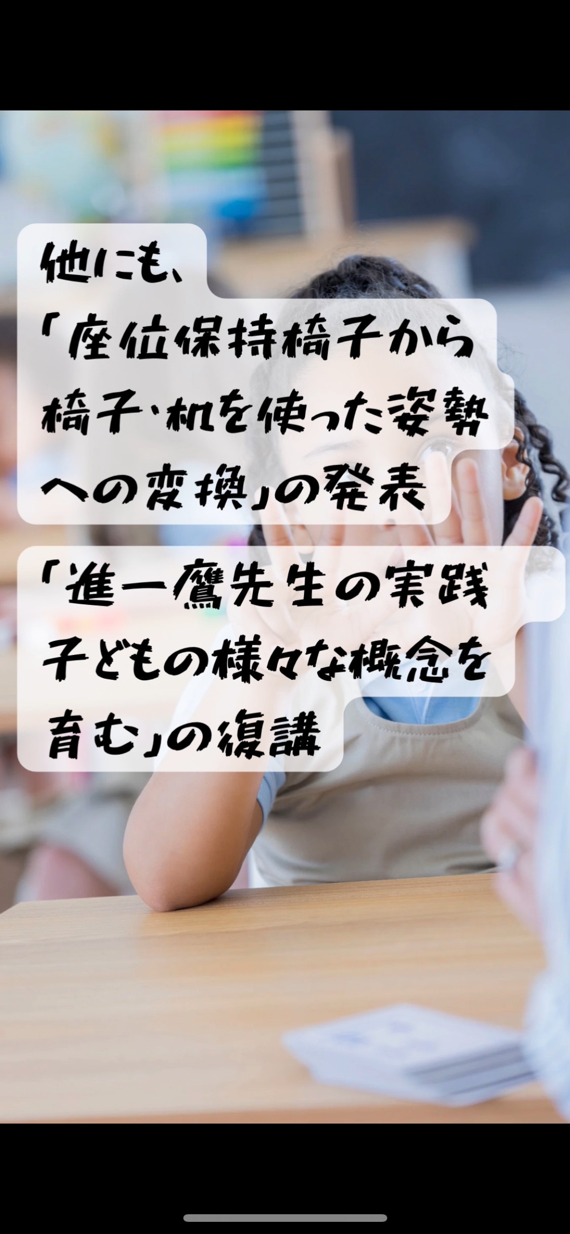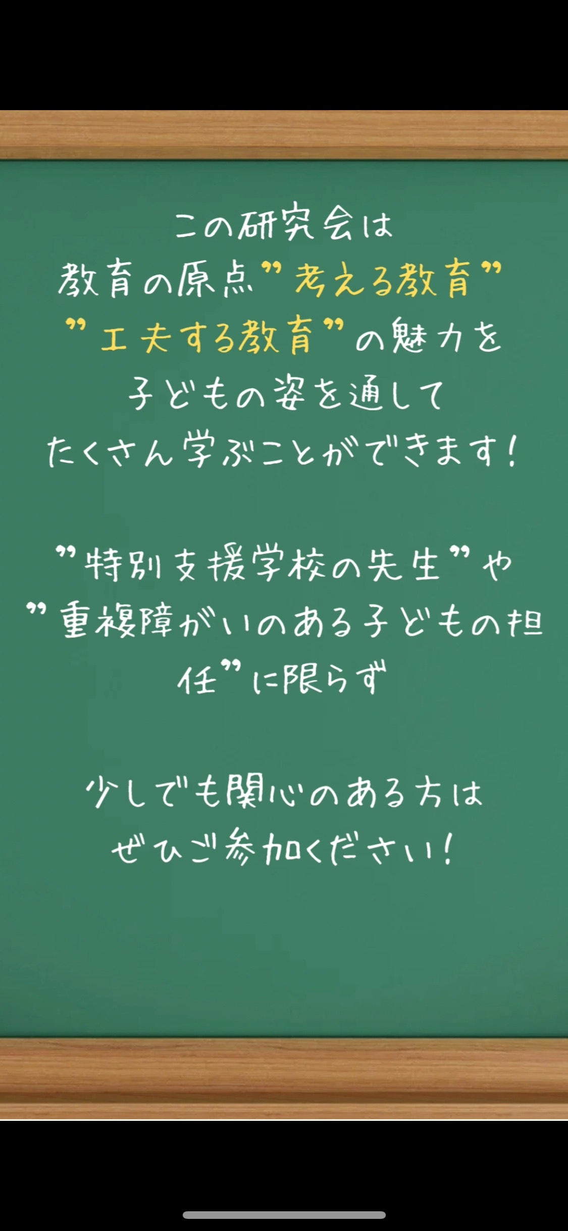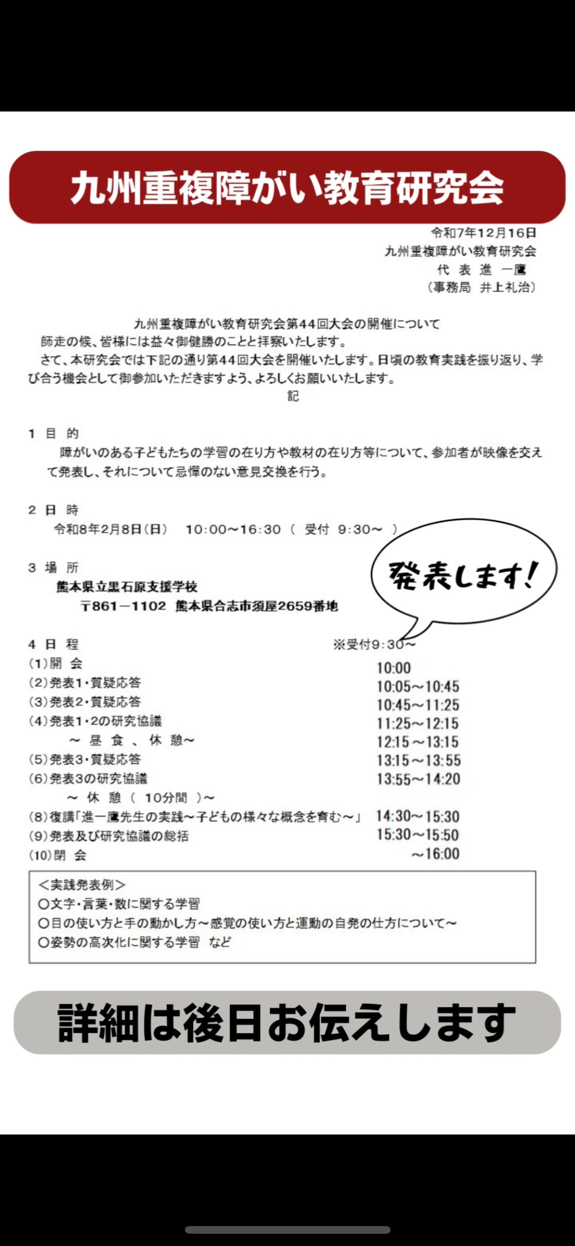 おっくん先生2025/12/29 13:48【お知らせ】実践発表九州重複障がい教育研究会で2/8(日)に発表します。内容は「視写と数の学習」です。オンラインでの参加も可能です。詳しくは添付の資料をご覧ください。 IMG_4646.png 2.98 MBIMG_4642.png 912.68 KBIMG_4644.png 1.03 MBIMG_4645.png 578.33 KBIMG_4647.png 2.87 MBIMG_4648.png 1.49 MB IMG_4649.png 527.49 KB このブログはメンバー投稿記事ですメンバー登録すると、限定記事の閲覧やメンバー同士の交流、限定イベントへの参加などができます。もっと詳しくメンバーの方はこちらからログインShare【お知らせ】実践発表縄跳び「ぐるぐるタオル」
